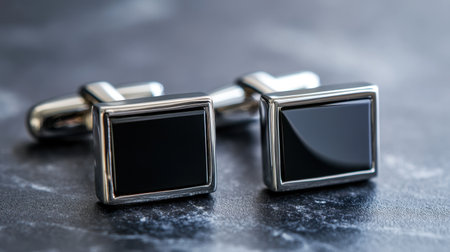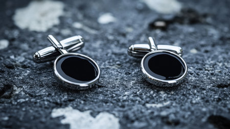 Explore these elegant black cufflinks resting on a stone surface, ideal for enhancing formal wear and adding a touch of luxury to outfits. Perfect for weddings or business events.