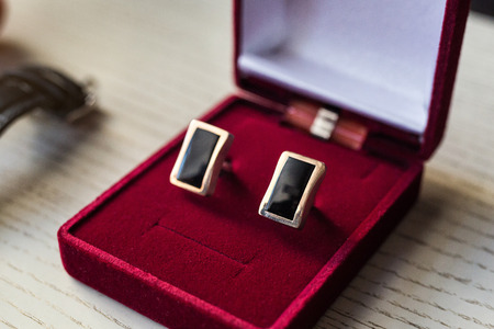 Men's cufflinks in a black jewelry box. Gold cufflinks on a white background of wooden boards. Groom's accessories. Wedding day