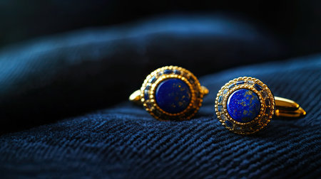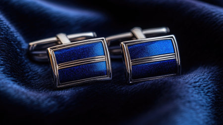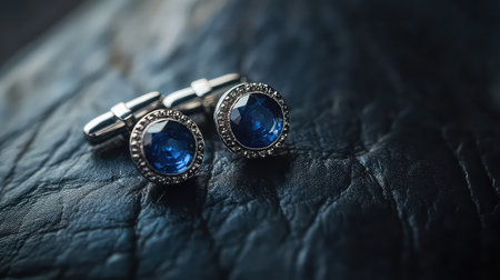 Close-up of elegant blue cufflinks displayed on soft dark fabric. Ideal for showcasing men
