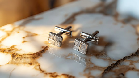 A pair of elegant silver cufflinks showcased on a polished marble surface, embodying luxury and sophistication for formal occasions and stylish attire.