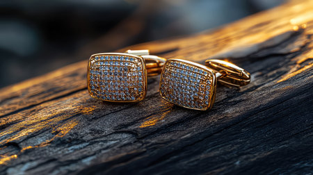 Stunning gold cufflinks adorned with sparkling stones resting on a textured wooden surface. Perfect for showcasing luxury fashion accessories in photography.