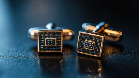 This image features an exquisite pair of elegant square cufflinks with dark blue detailing, meticulously showcased on a glossy surface. Perfect for formal attire and special occasions.