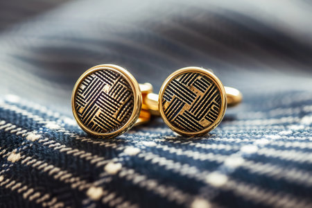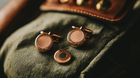 Close-up view of elegant gold cufflinks resting on a stylish fabric with leather detail. Ideal for adding a touch of sophistication to any formal outfit.
