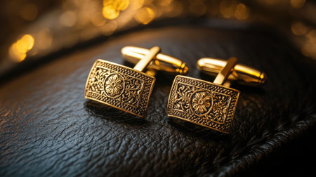 This stunning image captures elegant gold cufflinks resting on a textured vintage leather background, showcasing luxury and sophistication in fashion accessories.