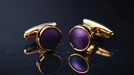 Captivating image of elegant gold cufflinks featuring a unique textured purple design, beautifully showcased on a reflective surface, ideal for enhancing formal wear.