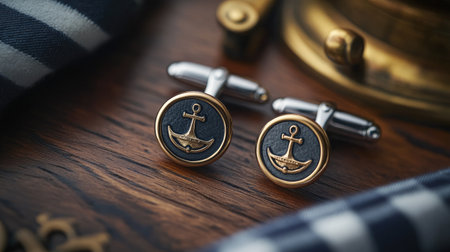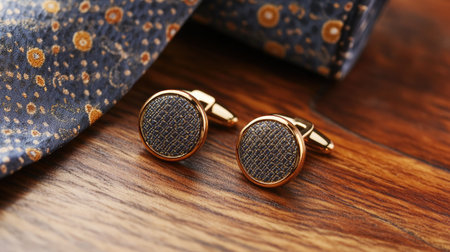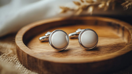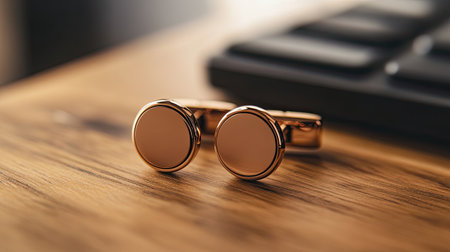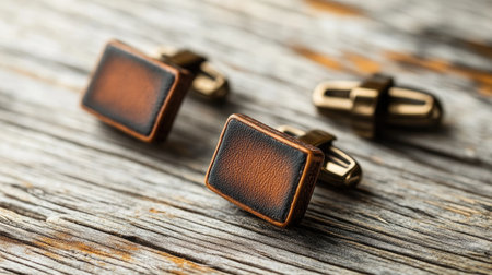 A pair of elegant cufflinks resting on a wooden surface, showcasing modern design and luxury. Ideal for enhancing business style and personal presentation.
