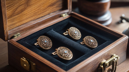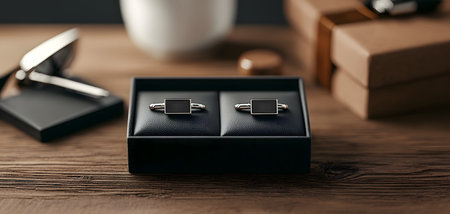 This image showcases elegant cufflinks in a sleek box, harmonizing with a wooden background. The atmosphere is refined and perfect for special gifts or formal occasions.