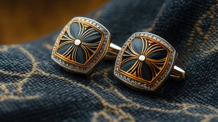 This image showcases an exquisite pair of black and gold cufflinks featuring intricate designs and sparkling details, set against a rich fabric background, perfect for enhancing any formal outfit.