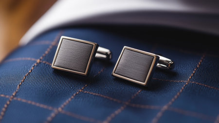 This close-up image showcases elegant square cufflinks resting on tailored blue fabric with a grid pattern, highlighting sophisticated accessories for formal occasions.