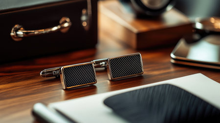 This image showcases elegant cufflinks placed on a wooden desk, complemented by stylish office accessories and a modern watch, perfect for enhancing professional attire.