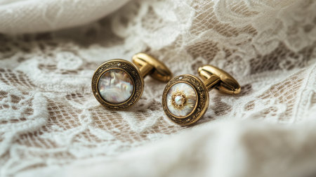Discover a pair of elegant antique cufflinks resting on delicate lace, capturing the essence of vintage fashion and timeless style with soft natural lighting.