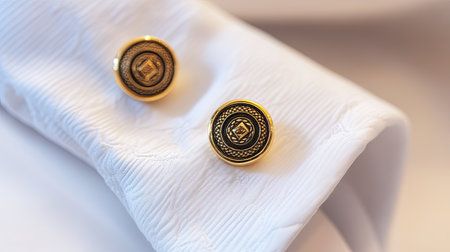 Close-up view of elegant gold cufflinks set against a crisp white shirt. This image captures the luxury and sophistication ideal for formal attire and styling.