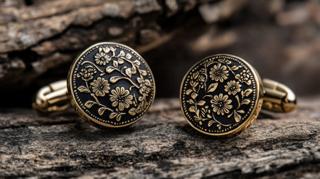 This image features a pair of elegant floral cufflinks with intricate detailing, set against a rustic wooden background, showcasing refined men's fashion accessories.