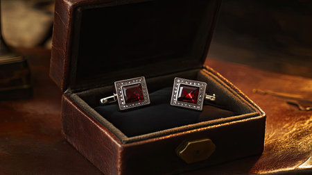 Luxurious silver cufflinks featuring stunning ruby stones nestled in an elegant leather jewelry box, perfect for gifting or personal use.