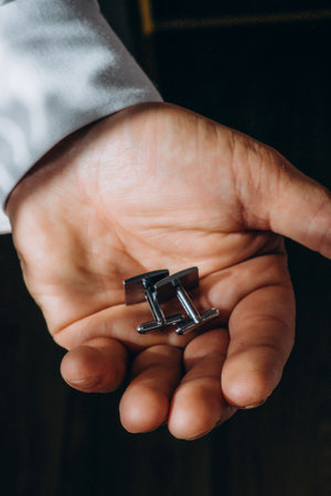 Close-up groom hands holds cufflinks. Elegant gentleman clothes, white shirt