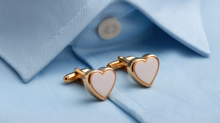 Close-up of elegant gold heart cufflinks on a light blue dress shirt, ideal for adding sophistication to any formal outfit and perfect for romantic gifting occasions.