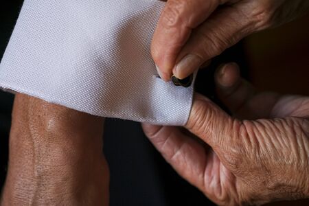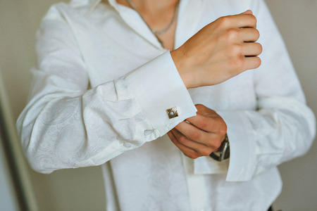 Close-up groom hands puts on cufflinks. Elegant gentleman clothers, white shirt