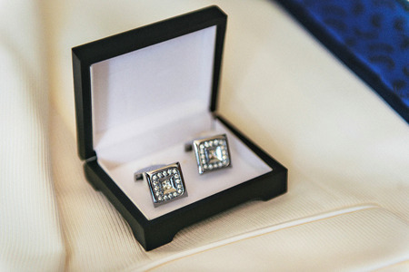 Men's cufflinks in a box, lying on a white jacket.