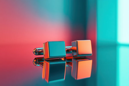 A sophisticated pair of minimalist cufflinks rests elegantly on a reflective surface showing their clean lines and modern design under dynamic colored lighting enhancing their visual appeal.