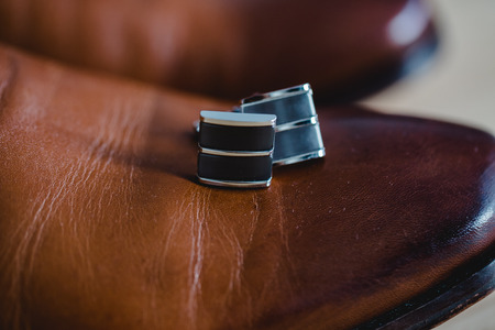 A pair of men's cufflinks on a mirror background. close-up. selective focus.