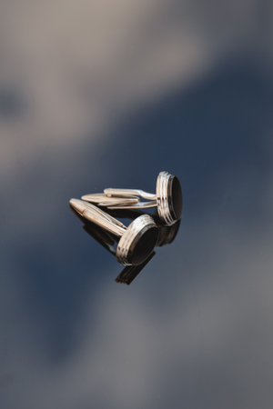 Stunning pair of silver cufflinks displayed on a dark reflective surface, perfect for formal attire and fashion photography, showcasing elegance and style.