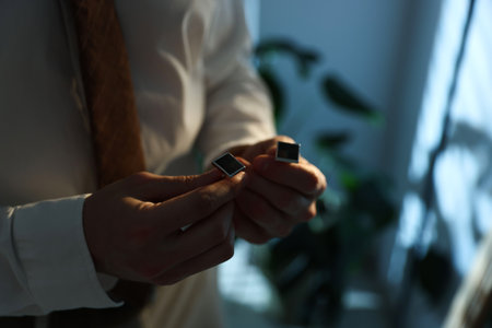 Man with cufflinks getting ready indoors, closeup. Space for text