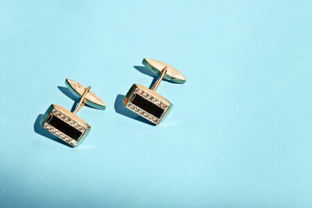Masculine accessorie - golden cufflinks isolated on blue background. Males fashion accessories.