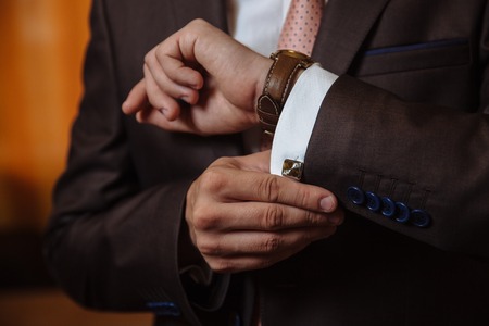 Closeup businessman hands with cufflinks. Man in a business suit, white shirt. Preparing the groom on the wedding day