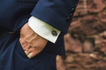 Wedding details, cufflinks, elegant male suit and hands