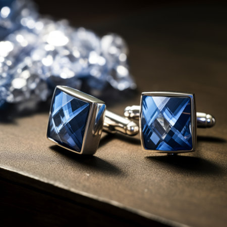 crystal cuff links in dark sky-blue and dark indigo offer a contemporary twist on the traditional square design. these realistic still lifes showcase dramatic lighting, luxurious textures, and jagged edges. elevate your style with these luxurious silver accessories. ai generated