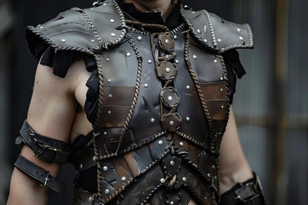 Muscular warrior wearing handmade leather armor is posing outdoors