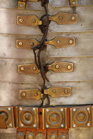 A detail picture from the old armory. The armor is on the wall and looking like pattern. Used by knights and soldiers in old middle ages.