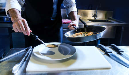 Professional chef cooking in the kitchen restaurant at the hotel, preparing dinner.