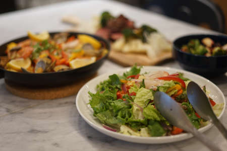 A variety of homemade dishes rest on a plain wooden table. The rustic surface complements the fresh, flavorful food, homey delight, low desire living , banner