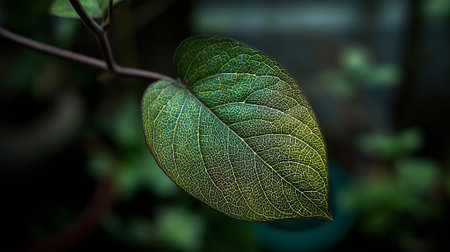 A detailed macro shot captures the natural beauty of a single green leaf. Its prominent veins and textured surface are highlighted, offering a close look at botanical details and organic patterns.