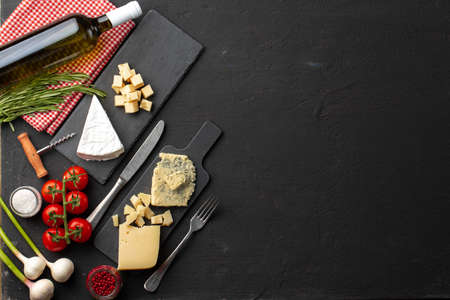 Cooking ingredients background. Spices, vegetables, garlic, yellow peppers chili. Black background, preparation food concept, flat lay, hard light, dark shadow, banner format
