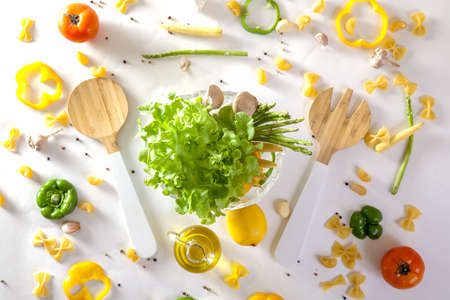 Variety of fresh vegetables and pasta on wooden board. Top view