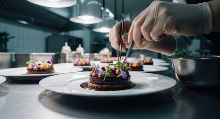 Talented food stylist meticulously preparing a beautifully decorated meal in a modern restaurant