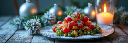 A beautifully arranged festive table features a vibrant fruit platter dusted with powdered sugar, surrounded by pine branches and glowing candles. silver ornaments add a touch of elegance, creating a cozy holiday atmosphere.