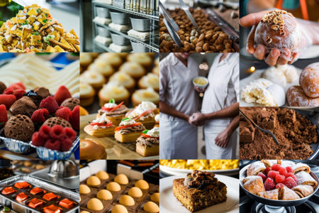 Various pastries and desserts displayed in a collage format showcasing different food manufacturing techniques, A collage of different food manufacturing techniques from around the world