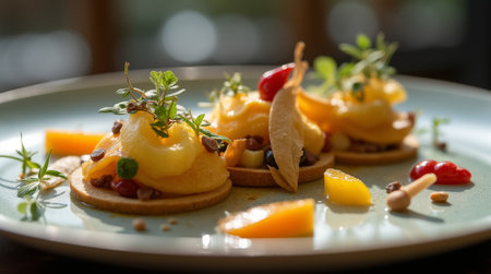 A beautifully arranged dessert showcases layers of fruits, garnished with herbs. The vibrant colors and intricate experience details capture a gourmet dining experience enjoyed in the afternoon.