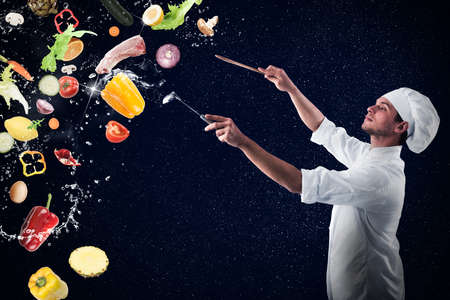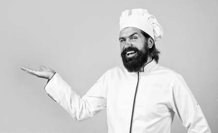 presenting product. handsome man with beard and moustache cooking food. professional restaurant cook baking. skilled baker use kitchen utensils for cooking. male chef in hat prepare healthy meal