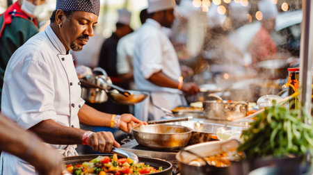 A vibrant kitchen scene with chefs from various countries preparing traditional dishes, sharing techniques, and celebrating cultural diversity through cuisine. International Music Festival: Musicians from around the world on a single stage, each playing