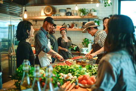Vegetarian cooking class chef guides participants in plating culinary creations with skill