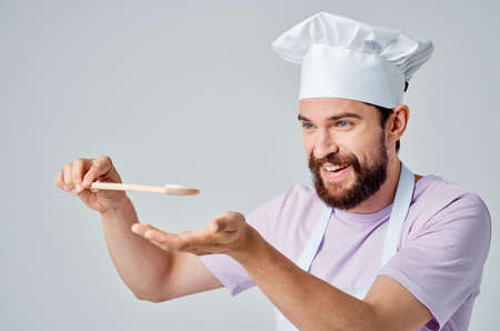 emotional bearded chef with a cap on his head holds a spoon in his hands restaurant Professional