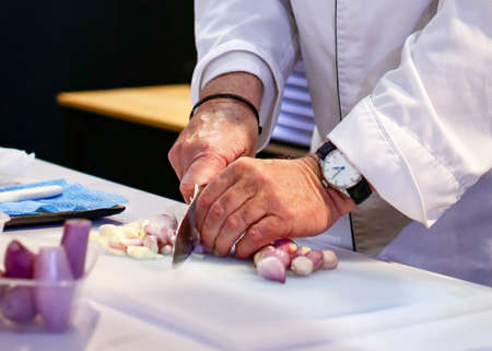 Belarus, Minsk, March 21, 2017. Culinary school. An open lesson on French cooking. The cook teaches you how to cook food. Master class cooking. Chef looks at food