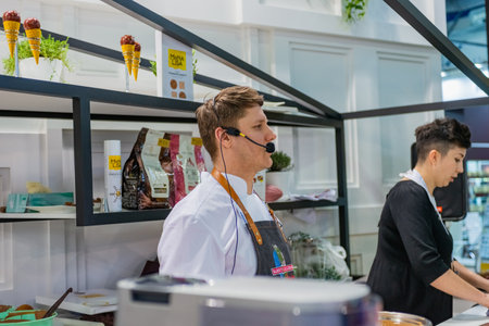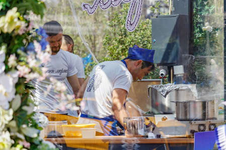 Moscow, Russia - June 02, 2019: Working cooks in pavilion showcase closeup at annual festival Fish week in Moscow 2019 on Manezhnaya Square