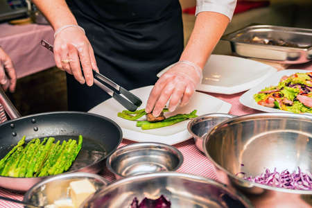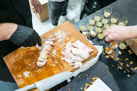 Chef's hands while cooking. Chefs prepare canapes in plastic glasses. Cooking snacks for a buffet table. Chef prepares small snacks or canapes. Cooking chicken breast dishes. Chicken dishes