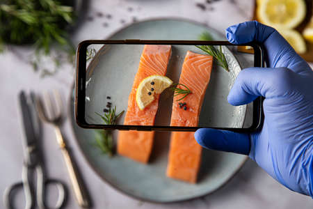 Man with gloves taking photos of food on table