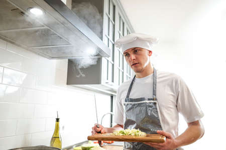 Professional chef cooking in the kitchen restaurant at the hotel, preparing dinner. A cook in an apron makes a salad of vegetables and pizza.